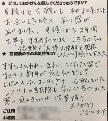 トップページ > お客様の声一覧 > 2年間工事をすすめなかったが、待ってていてくれた。