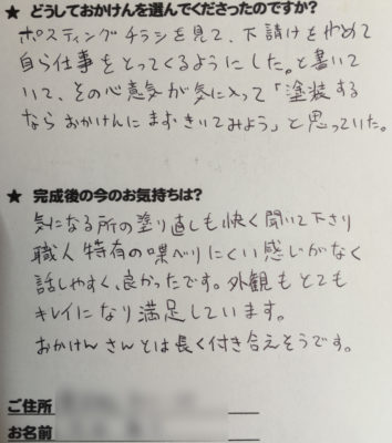 トップページ > お客様の声一覧 > 塗装するならおかけんさんにまず聞いてみようと思っていた