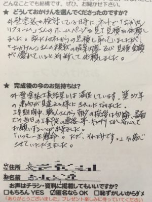 外壁塗装工事結果には満足しています。築37年の建物が見違える様にきれいになりました。工事期間中職人さんから朝夕の挨拶は勿論、書面での当日の工事予定の連絡等、きっちりされ安心してお願いすることが出来ました。 「いつも一生懸命。ただ、それだけです。」を感じさせていただきました。