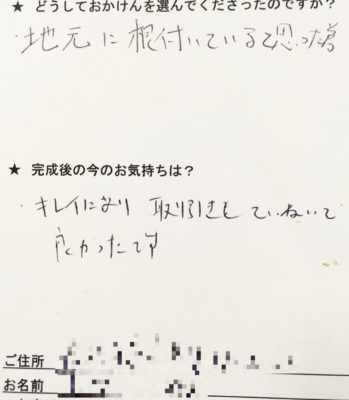 お客様から頂いた大切なお客様の声をご紹介させていただきます 取引きもていねいでよかったです 彦根市小泉町 Iさま ★どうして、おかけん?? 地元に根付いていると思った為。 ★完成後の、今のお気持ちは? キレイになり、取引もていねいで良かったです。