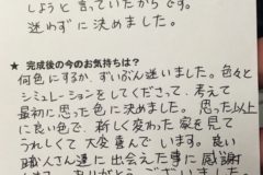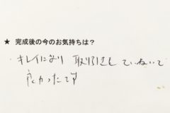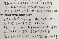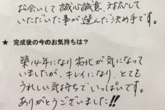 ...社長さんも誠実な人でしたけれども、それと同様に職人さん達もみんな礼儀正しくて仕事も無駄口も叩かず、一生懸命やってくれて、社長に内緒で私の余計な仕事も断ることなく嫌な顔せずやってくれたので、本当に感謝しております。